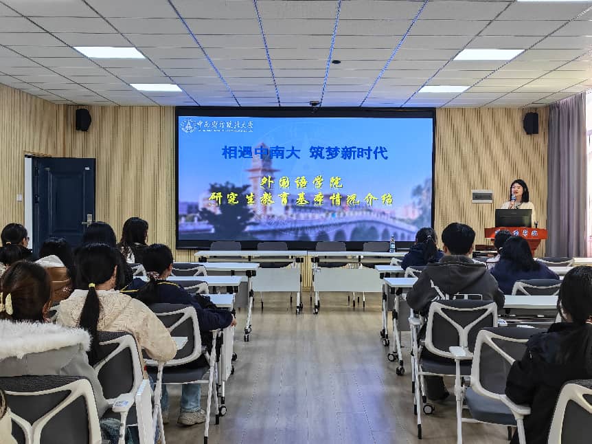 (通讯员:孙乐洋)为帮助我院学生精准把握考研方向、深入了解目标院校研究生培养情况,2025年3月12日(周四)15:00,我院于3号楼三楼会议室举办“相遇中南大 筑梦新时代”研究生教育宣讲会。本次宣讲由中南财经政法大学徐天媛老师担任主讲,23级考研班(23英语1、2班全体学生)及23级意向考研学生参会。