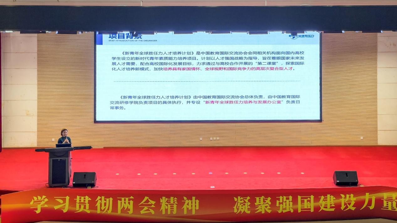 宣讲会上,项目负责人姚怡冰老师首先介绍了项目发起背景与主办单位。该项目由教育部中国教育国际交流协会牵头,联合联合国相关国际组织共同实施,致力于为中国青年搭建高水平国际交流与实地实践平台,通过沉浸式参访与系统化培训,帮助学生树立全球视野,提升跨文化沟通、国际协作与全球治理参与能力。项目遴选严格、名额稀缺,全国170所申报院校中仅部分高校获得推荐资格,本年度全国共设100余个名额,我校获批5 个推荐席位。