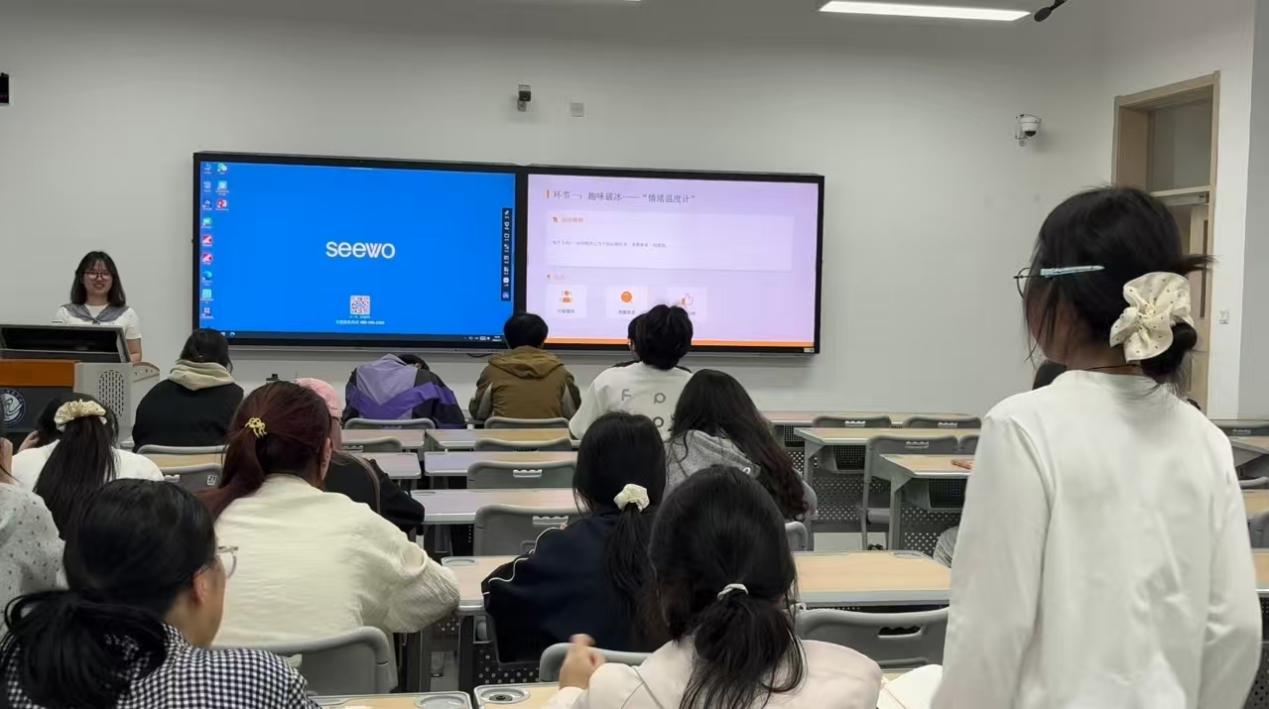 在评比展示环节,各班紧扣情绪管理、自我认知与互助成长等核心内容,设计了丰富多元的活动形式。英语1班带来《春季情绪调节的实用自助技巧》主题讲座,主讲人结合生动案例与科普知识,从光照运动、睡眠节律、正念技术等维度,深入浅出地讲解了情绪管理的科学方法。屏幕上寓意深刻的卡通插画,提醒大家在情绪波动中学会寻找平衡,台下同学专注聆听,互动频频。